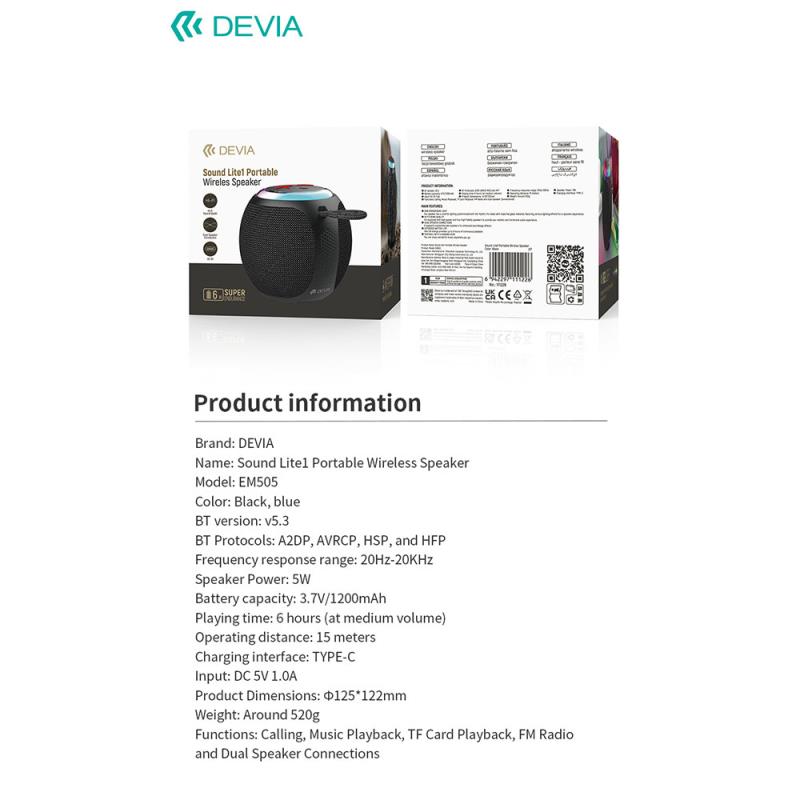 Το φορητό ηχείο Bluetooth Devia EM505 Sound Lite1 παρέχει ισχυρό ήχο σε πρακτικό μέγεθος, ιδανικό για ταξίδια και εκδρομές. Με Bluetooth 5.3, υποστηρίζει τα πρωτόκολλα A2DP, AVRCP, HSP και HFP, εξασφαλίζοντας σταθερές συνδέσεις έως και 15 μέτρα. Το ηχείο παρέχει πλούσιο εύρος συχνοτήτων από 20Hz έως 20KHz, τροφοδοτούμενο από έξοδο 5W για καθαρό ήχο. Εξοπλισμένο με μπαταρία 1200mAh, προσφέρει έως και 6 ώρες αναπαραγωγής σε μεσαία ένταση. Η συσκευή περιλαμβάνει λειτουργίες όπως αναπαραγωγή μουσικής, κλήσεις, υποστήριξη κάρτας TF, ραδιόφωνο FM και συνδεσιμότητα διπλού ηχείου. Το EM505 φορτίζει μέσω USB C, καθιστώντας το ευέλικτο και εύκολο στην επαναφόρτιση. Με τον ελαφρύ σχεδιασμό του (περίπου 520 g) και την ανθεκτική κατασκευή του, αυτό το ηχείο αποτελεί ιδανικό σύντροφο για τους λάτρεις της μουσικής.