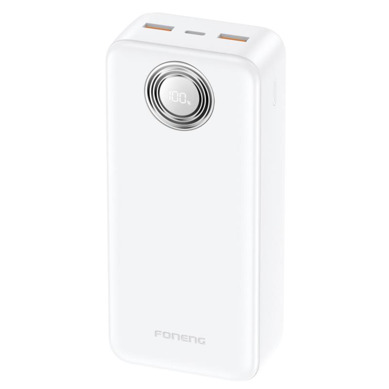 Το Foneng PX103 είναι ένα power bank 30000 mAh με γρήγορη φόρτιση 22.5W σε τρεις θύρες εξόδου. Η είσοδος USB C υποστηρίζει 5V/3A και 9V/2A, ενώ οι έξοδοι περιλαμβάνουν μια θύρα USB C (PD) και δύο θύρες USB A με συνδυασμένη γρήγορη έξοδο. Έχει διαστάσεις περίπου 145x70x50mm και ζυγίζει περίπου 600g. Διαθέτει οθόνη LCD για την κατάσταση της μπαταρίας και είναι πιστοποιημένο σύμφωνα με το πρότυπο ασφαλείας 3C.