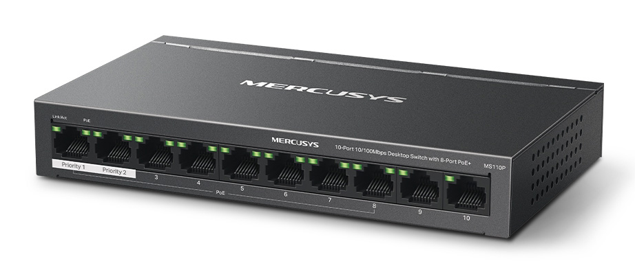Το desktop switch της Mercusys σας επιτρέπει να επεκτείνετε το ενσύρματο δίκτυο σας με 10x 10/100Mbps θύρες, εκ των οποίων οι 8x υποστηρίζουν PoE+.