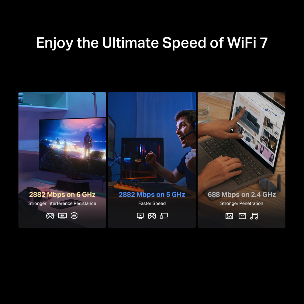 Ταχύτητες έως 2882 Mbps (6 GHz) + 2882 Mbps (5 GHz) + 688 Mbps (2.4 GHz) για κορυφαία ασύρματη απόδοση.