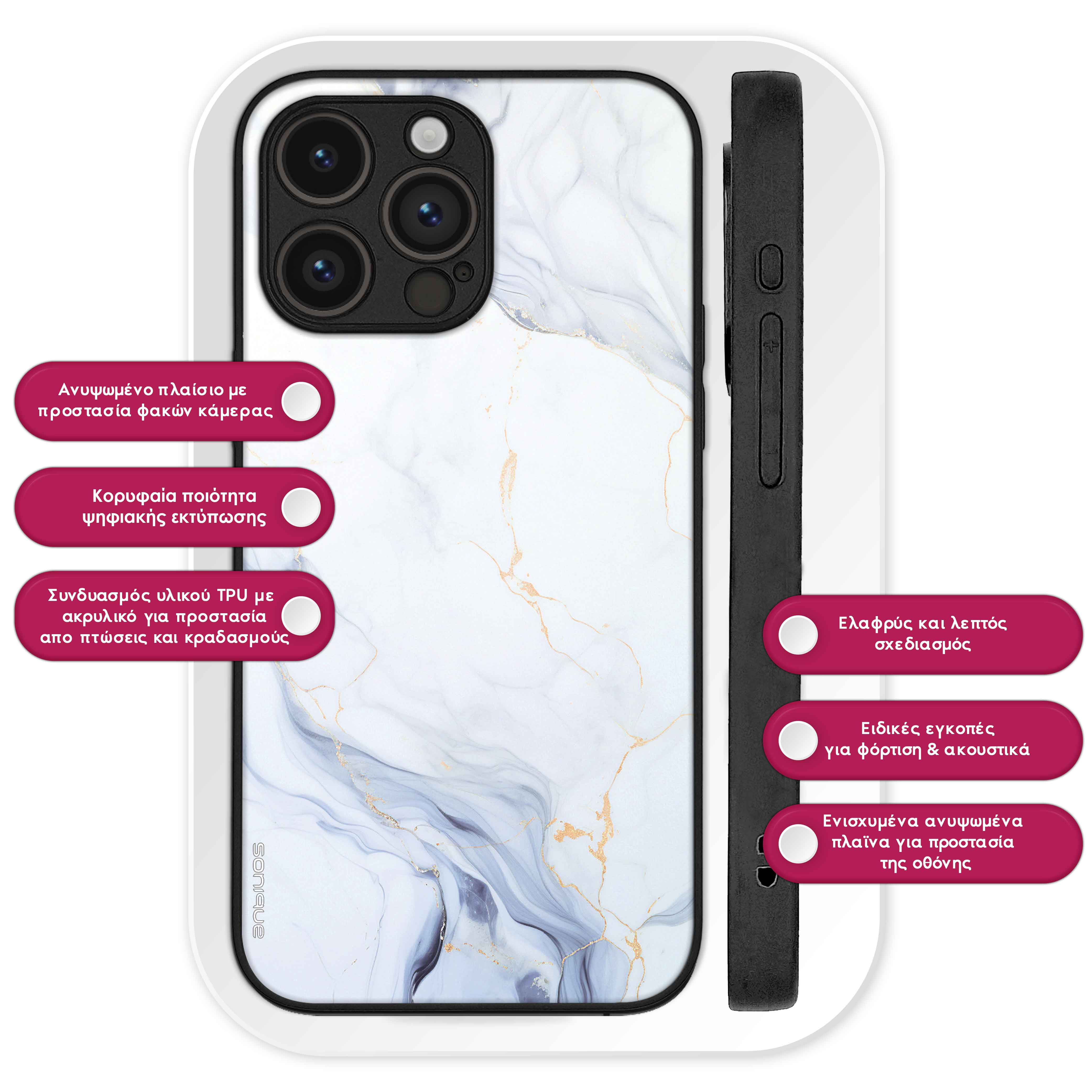 Η Θήκη Sonique Marble προσφέρει μοναδική κομψότητα και ασφάλεια για το κινητό σας. Το εκλεπτυσμένο σχέδιο μαρμάρου σε συνδυασμό με την ψηφιακή εκτύπωση υψηλής ποιότητας δημιουργεί ένα εντυπωσιακό αποτέλεσμα που δεν ξεθωριάζει με την πάροδο του χρόνου. Κατασκευασμένη από ανθεκτική σιλικόνη με ακρυλικό πίσω μέρος, η θήκη αυτή προστατεύει αποτελεσματικά τη συσκευή σας από καθημερινές φθορές και γρατσουνιές, ενώ παράλληλα διατηρεί την πολυτελή της εμφάνιση.Επιπλέον, η θήκη διαθέτει αντιολισθητικό κράτημα, προσφέροντας ασφαλή αίσθηση στο χέρι και μειώνοντας τον κίνδυνο ατυχημάτων από γλιστρήματα. Διατίθεται σε ποικιλία σχεδίων και χρωμάτων, για να βρείτε το ιδανικό στυλ που ταιριάζει με την προσωπικότητά σας. Απογειώστε την εμφάνιση και την προστασία του κινητού σας με την Sonique Marble, που συνδυάζει μοντέρνο design και πρακτικότητα.