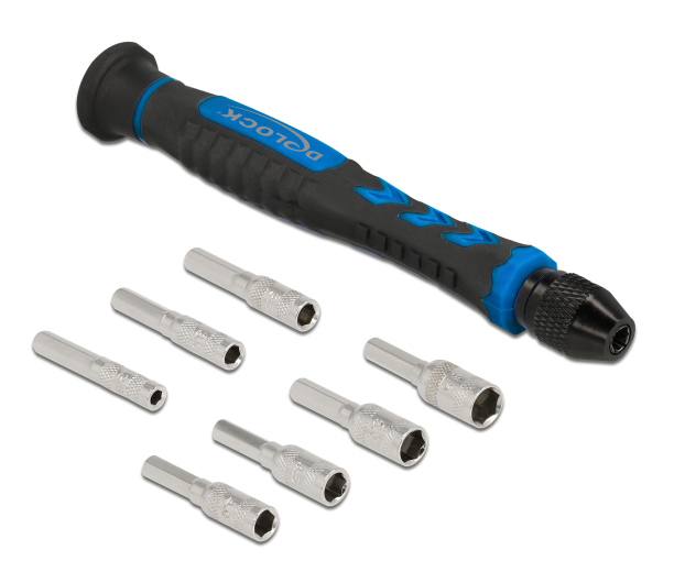 Πρακτικό σετ από την Delock που περιλαμβάνει ένα κατσαβίδι και 7 διαφορετικές εξάγωνες bit κεφάλες. Το κατσαβίδι διαθέτει σπείρωμα με κλείδωμα, παρόμοιο με τρυπάνι, το οποίο κρατά τις κεφαλές με ασφάλεια ενώ η αντιολισθητική λαβή του το καθίστα εξαιρετικά σταθερό κατά την εργασία.