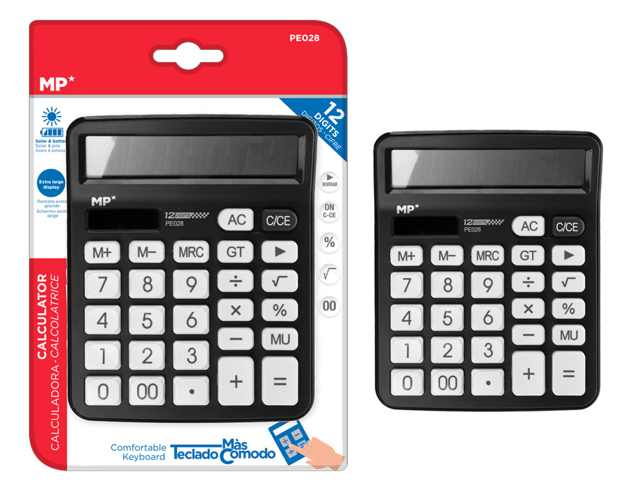 MP αριθμομηχανή PE028, ηλιακό & μπαταρίες, 12 ψηφία, μαύρη PE028