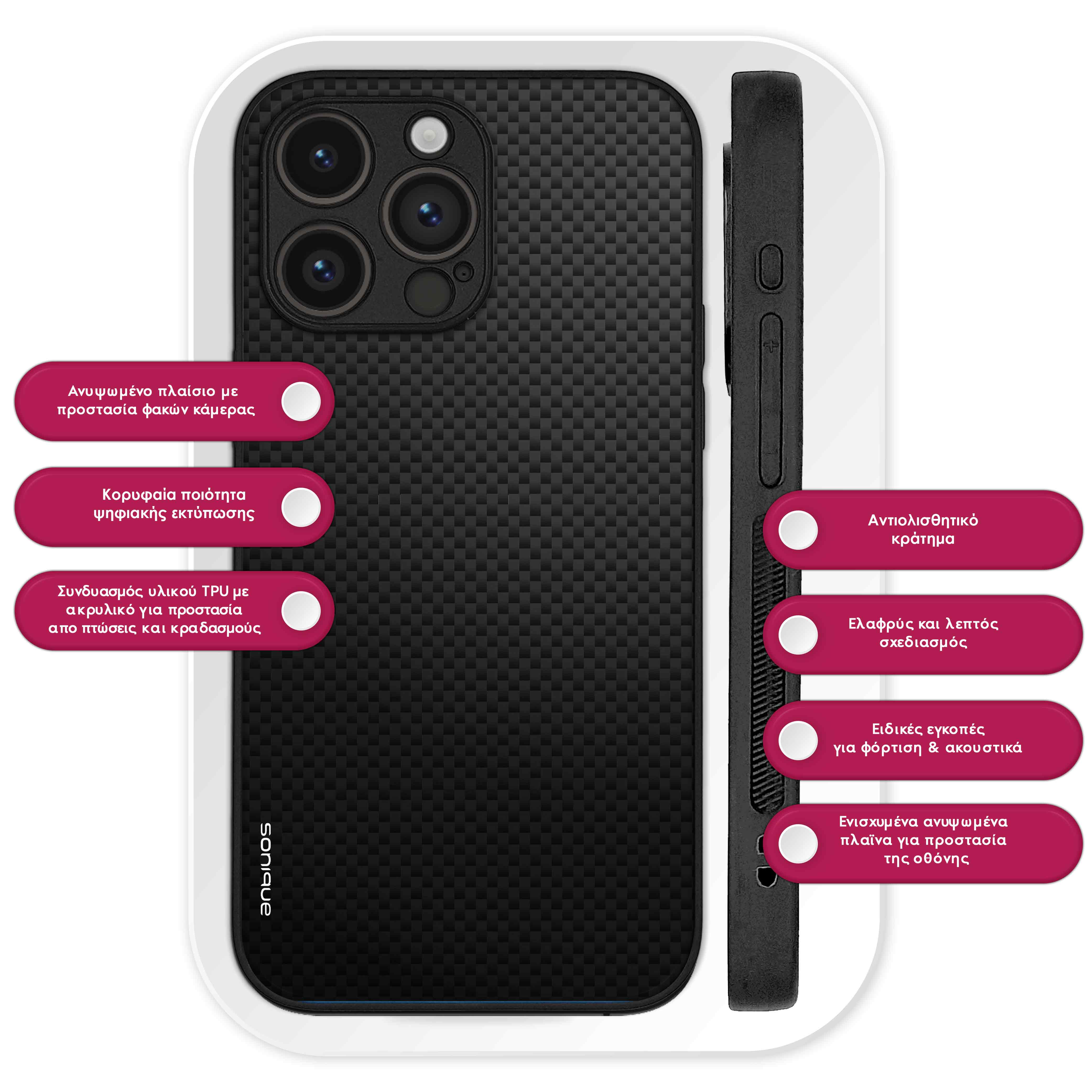 Η Θήκη Sonique Carbon Series προσφέρει μοναδική κομψότητα και ασφάλεια για το κινητό σας. Το εκλεπτυσμένο σχέδιο Carbon σε συνδυασμό με την ψηφιακή εκτύπωση υψηλής ποιότητας δημιουργεί ένα εντυπωσιακό αποτέλεσμα που δεν ξεθωριάζει με την πάροδο του χρόνου. Κατασκευασμένη από ανθεκτική σιλικόνη με ακρυλικό πίσω μέρος, η θήκη αυτή προστατεύει αποτελεσματικά τη συσκευή σας από καθημερινές φθορές και γρατσουνιές, ενώ παράλληλα διατηρεί την πολυτελή της εμφάνιση. Επιπλέον, η θήκη διαθέτει αντιολισθητικό κράτημα, προσφέροντας ασφαλή αίσθηση στο χέρι και μειώνοντας τον κίνδυνο ατυχημάτων από γλιστρήματα. Διατίθεται σε ποικιλία σχεδίων και χρωμάτων, για να βρείτε το ιδανικό στυλ που ταιριάζει με την προσωπικότητά σας. Απογειώστε την εμφάνιση και την προστασία του κινητού σας με την Sonique Carbon που συνδυάζει μοντέρνο design και πρακτικότητα.
