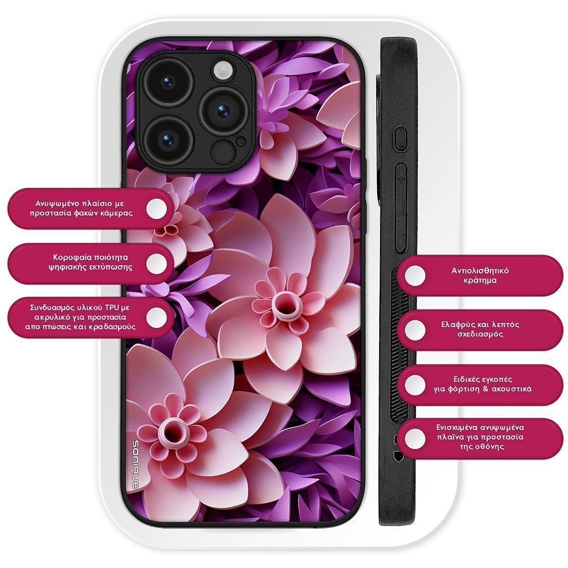 Η Θήκη Sonique 3D flower Series προσφέρει μοναδική κομψότητα και ασφάλεια για το κινητό σας. Το εκλεπτυσμένο σχέδιο 3D flower σε συνδυασμό με την ψηφιακή εκτύπωση υψηλής ποιότητας δημιουργεί ένα εντυπωσιακό αποτέλεσμα που δεν ξεθωριάζει με την πάροδο του χρόνου. Κατασκευασμένη από ανθεκτική σιλικόνη με ακρυλικό πίσω μέρος, η θήκη αυτή προστατεύει αποτελεσματικά τη συσκευή σας από καθημερινές φθορές και γρατσουνιές, ενώ παράλληλα διατηρεί την πολυτελή της εμφάνιση.Επιπλέον, η θήκη διαθέτει αντιολισθητικό κράτημα, προσφέροντας ασφαλή αίσθηση στο χέρι και μειώνοντας τον κίνδυνο ατυχημάτων από γλιστρήματα. Διατίθεται σε ποικιλία σχεδίων και χρωμάτων, για να βρείτε το ιδανικό στυλ που ταιριάζει με την προσωπικότητά σας. Απογειώστε την εμφάνιση και την προστασία του κινητού σας με την Sonique 3D flower, που συνδυάζει μοντέρνο design και πρακτικότητα.