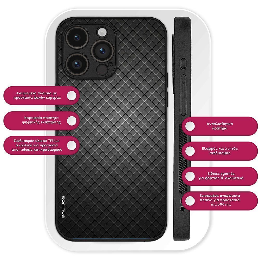 Η Θήκη Sonique Carbon Series προσφέρει μοναδική κομψότητα και ασφάλεια για το κινητό σας. Το εκλεπτυσμένο σχέδιο Carbon σε συνδυασμό με την ψηφιακή εκτύπωση υψηλής ποιότητας δημιουργεί ένα εντυπωσιακό αποτέλεσμα που δεν ξεθωριάζει με την πάροδο του χρόνου. Κατασκευασμένη από ανθεκτική σιλικόνη με ακρυλικό πίσω μέρος, η θήκη αυτή προστατεύει αποτελεσματικά τη συσκευή σας από καθημερινές φθορές και γρατσουνιές, ενώ παράλληλα διατηρεί την πολυτελή της εμφάνιση. Επιπλέον, η θήκη διαθέτει αντιολισθητικό κράτημα, προσφέροντας ασφαλή αίσθηση στο χέρι και μειώνοντας τον κίνδυνο ατυχημάτων από γλιστρήματα. Διατίθεται σε ποικιλία σχεδίων και χρωμάτων, για να βρείτε το ιδανικό στυλ που ταιριάζει με την προσωπικότητά σας. Απογειώστε την εμφάνιση και την προστασία του κινητού σας με την Sonique Carbon που συνδυάζει μοντέρνο design και πρακτικότητα.