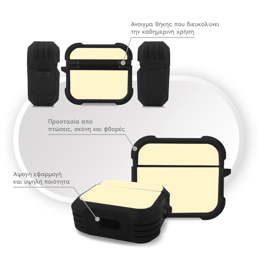 Κατασκευασμένη από ανθεκτική σιλικόνη με ενισχυμένες γωνίες τύπου armor, η θήκη προστατεύει αποτελεσματικά τα AirPods σας από φθορές, γρατσουνιές και μικρές πτώσεις.