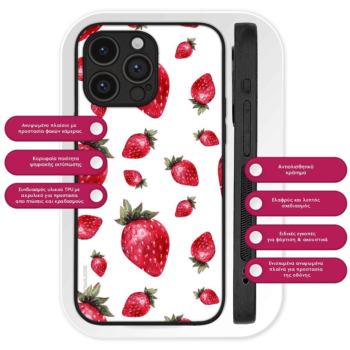 Δώστε μια δόση φρεσκάδας στο κινητό σας με τη σειρά Sonique Fruit Series. Με ζωηρά fruit prints και μοναδικά χρώματα, αυτές οι θήκες συνδυάζουν απόλυτα το καλοκαιρινό στυλ με την καθημερινή προστασία. Κατασκευασμένες από ανθεκτική σιλικόνη με ακρυλικό πίσω μέρος, προστατεύουν αποτελεσματικά από φθορές, πτώσεις και γρατσουνιές. Η ψηφιακή εκτύπωση υψηλής ποιότητας εξασφαλίζει ζωντανά σχέδια που δεν ξεθωριάζουν με τον χρόνο, ενώ η αντιολισθητική υφή προσφέρει σταθερό και άνετο κράτημα.