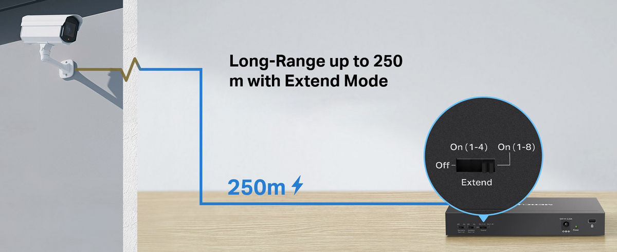 Αυξάνει την απόσταση μετάδοσης PoE στα 25 μ μέσω της Λειτουργίας Επέκτασης (Extend Mode)