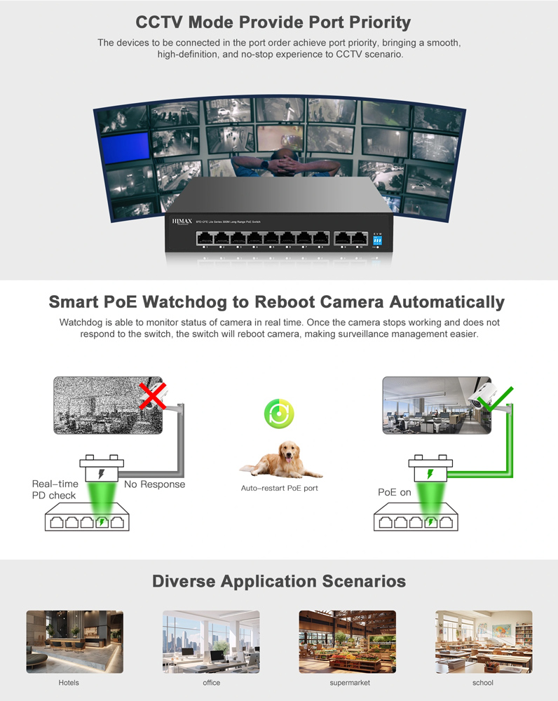 Support Watchdog function by default: 1-8 Port support AI-PoE Network self-healing mode (PoE Watchdog function), Automatic solve the camera problem & reduce after-sale.