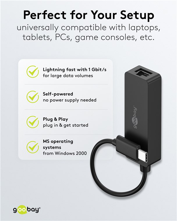 Ο αντάπτορας δικτύου της Goobay συνδέεται στον υπολογιστή ή το laptop σας μέσω θύρας USB-C, επεκτείνοντας τις θύρες του με 1x θύρα RJ45, η οποία επιτρέπει την ενσύρματη σύνδεση στο δίκτυο με ταχύτητες έως 1000Mbps.