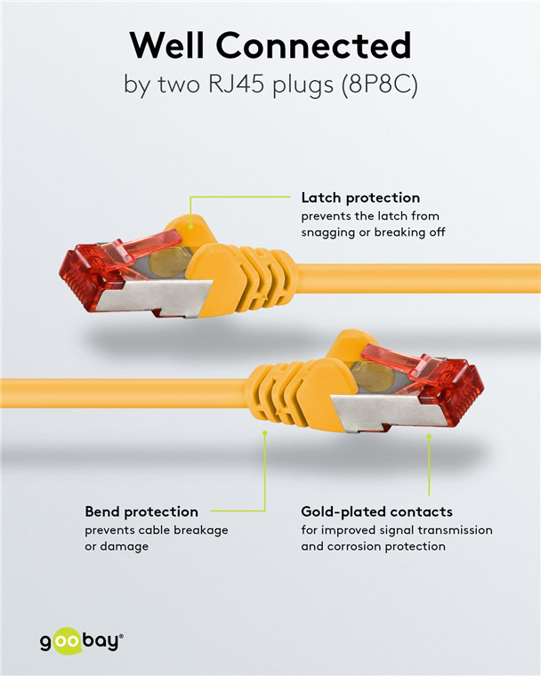 Τα καλώδια δικτύου της Goobay κατασκευάζονται από ποιοτικά υλικά, με τις υψηλότερες τεχνικές προδιαγραφές, προσφέροντας αξιόπιστη λειτουργία υψηλής απόδοσης, με αντοχή στον χρόνο.