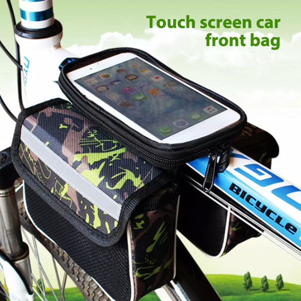 Τσαντάκι ποδηλάτου που προσαρμόζετε στο εμπρός μέρος του ποδηλάτου, πίσω από το τιμόνι. Είναι κατασκευασμένο από υψηλής ποιότητας υλικά και αδιάβροχο. Είναι ιδιαίτερα ευρύχωρο, ιδανικό για την τοποθέτηση γαντιών, γυαλιών και άλλων εργαλείων και εξαρτημάτων του ποδηλάτου. To σετ αποτελείται από δύο διαφορετικά τσαντάκια διαστάσεων 17x13 cm τα οποία τοποθετούνται εκατέρωθεν του κεντρικού άξονα του ποδηλάτου. Το τσαντάκι δένει με ειδικούς ιμάντες με υλικό velcro το οποίο εγγυάται εύκολη τοποθέτηση/αφαίρεση και σταθερότητα κατά την άθληση. Στο επάνω μέρος έχει ειδική θήκη για την τοποθέτηση του κινητού τηλεφώνου. Η θήκη για το τηλέφωνο εξοπλίζεται με αυτοκόλλητα τύπου velcro που μπορεί εύκολα να αφαιρεθεί και παρέχει απόλυτη σταθεροποίηση της συσκευής, ενώ το επάνω, διάφανο μέρος της, είναι συμβατό με touch οθόνες.