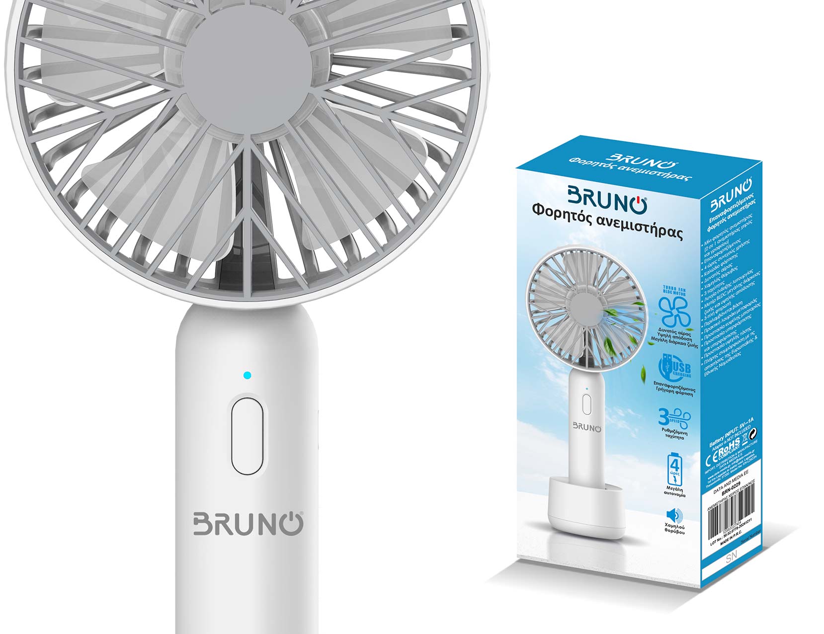 BRUNO φορητός ανεμιστήρας χειρός BRN-0229, επαναφορτιζόμενος, με βάση & λουράκι μεταφοράς, λευκός/γκρι BRN-0229