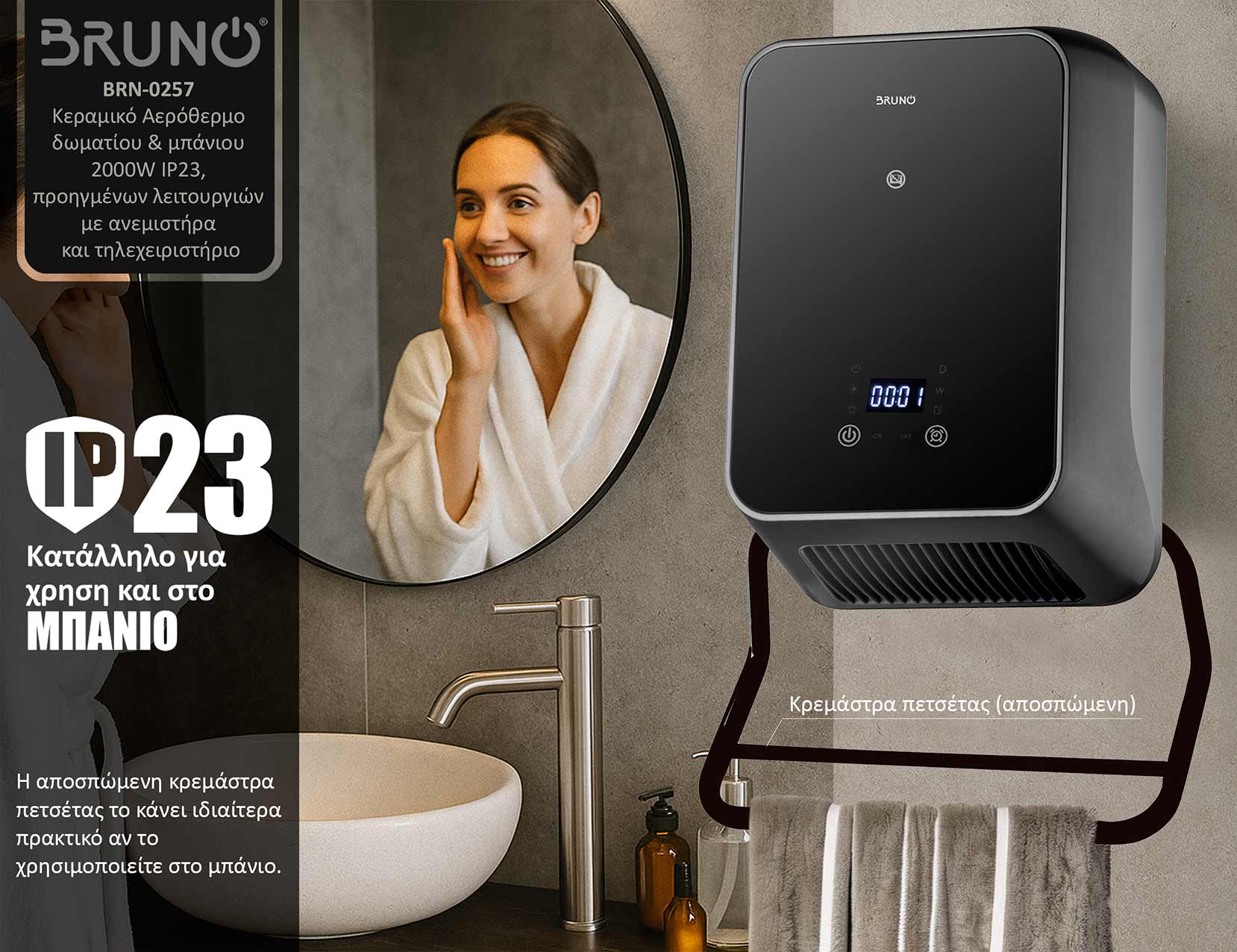BRUNO κεραμικό αερόθερμο δωματίου & μπάνιου BRN-0257, 2000W, IP23, προηγμένων λειτουργιών, με ανεμιστήρα BRN-0257