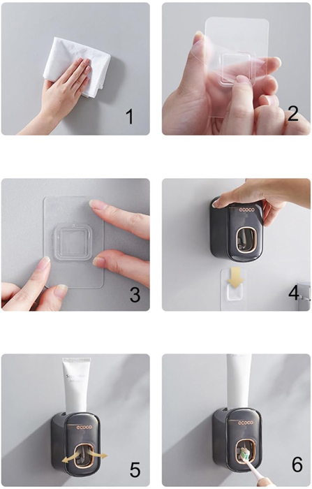 Τοποθετείται εύκολα στον τοίχο με αυτοκόλλητη βάση η οποία αποσπάται από τον διανεμητή. Με τον διανεμητή θα βάλετε εύκολα οδοντόκρεμα στην οδοντόβουρτσα σας, σπρώχνοντας την οδοντόβουρτσα στην ειδική εσοχή του διανεμητή.