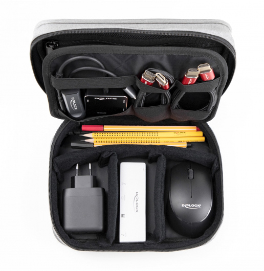 Αυτή η πρακτική θήκη οργάνωσης της Delock όχι μόνο εντυπωσιάζει με τον μοντέρνο σχεδιασμό της αλλά επίσης προσφέρει αρκετό χώρο για την αποθήκευση διαφόρων αξεσουάρ όπως καλώδια, power bank, σκληρούς δίσκους, ακουστικά και άλλα.