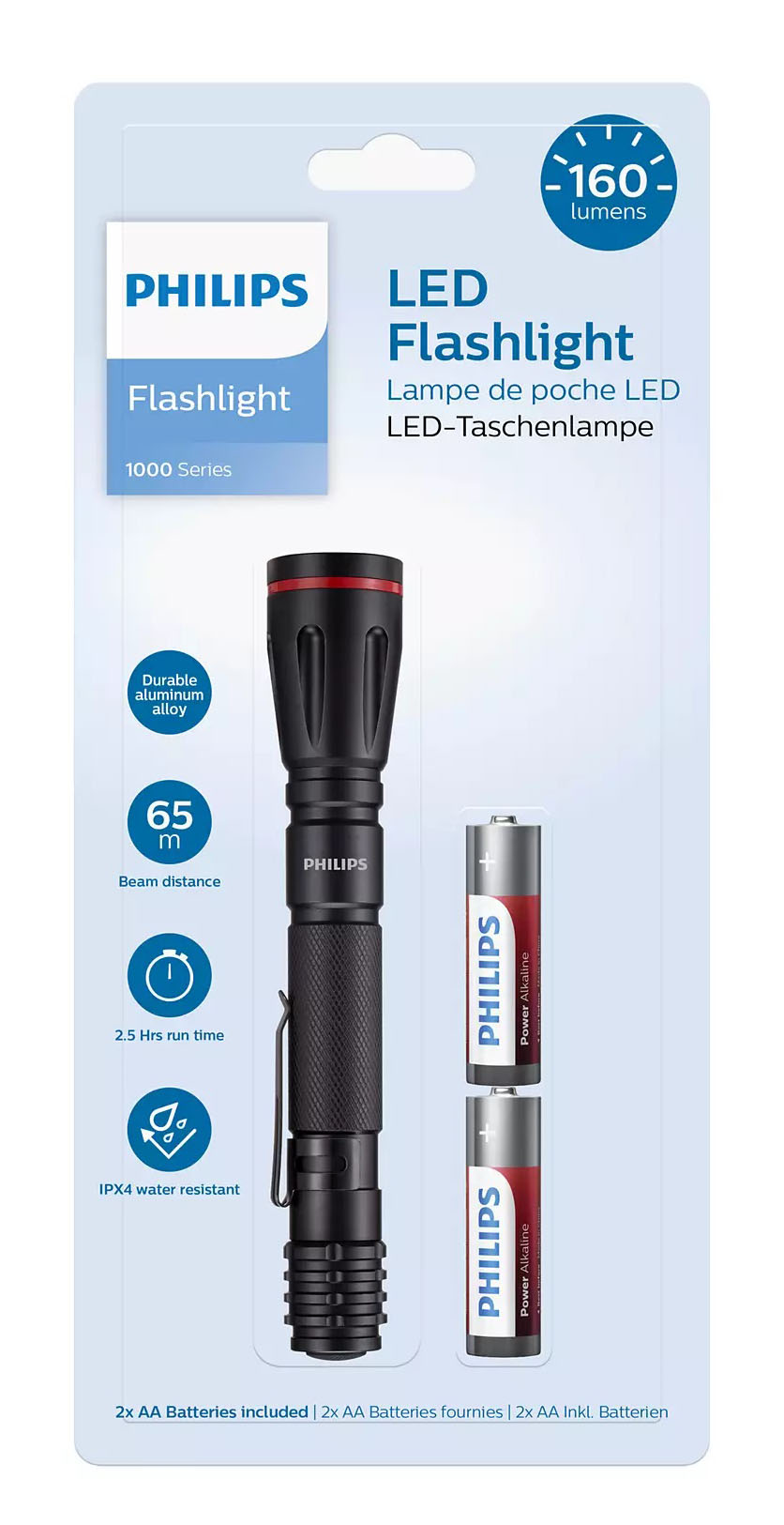 Ελαφρύς και φορητός φακός LED SFL1001P απο την Philips. Ο LED φακός καθημερινής χρήσης, καλύπτει τις ανάγκες σας για φως μέσα αλλά και έξω από το σπίτι. Ιδανική λύση για να τον έχετε πάντοτε κοντά σας μέσα στο σπίτι ή στην εργαλειοθήκη σας. Το μικρό του μέγεθος τον καθιστά εύχρηστο και λειτουργικό κάτω από όλες τις συνθήκες. Τεχνολογία LED που παρέχει άπλετο φως με ελάχιστη κατανάλωση. Παρέχει φωτεινότητα 160 lumens με έως και 2 ώρες αυτονομίας με δύο μπαταρίες ΑΑ (συμπεριλαμβάνονται στην συσκευασία). Ελαφρύς και ανθεκτικός, φτιαγμένος απο κράμα αλουμινίου και με πιστοποίηση IPX4 για να αντέχει σε νερό και υγρασία. Η ακτίνα του μπορεί να φωτίσει έως και τα 65 μέτρα.