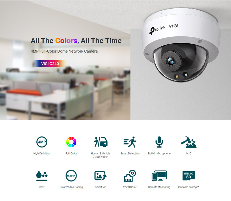 Δικτυακή κάμερα της TP-LINK με φακό 4mm και αισθητήρα ανάλυσης 4MP. Υποστηρίζει έγχρωμη νυχτερινή όραση, τροφοδοσία PoE, καταγραφή σε κάρτα micro SD (δεν συμπεριλαμβάνεται) και εξοπλίζεται με εσωτερικό μικρόφωνο για μεταφορά ήχου.