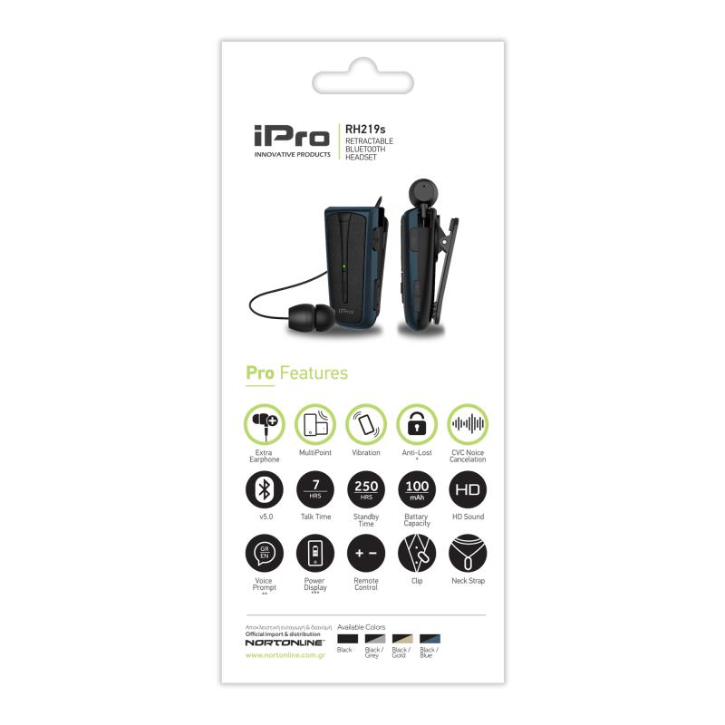Στερεοφωνικό Ακουστικό Bluetooth iPro RH219s Retractable με Δόνηση Μαύρο-Μπλε