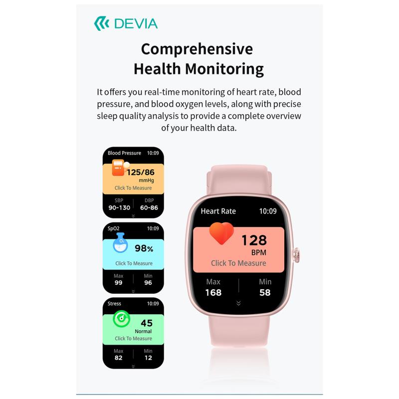 Το Devia WT5 είναι ένα κομψό και πρακτικό smartwatch με ζωντανή οθόνη αφής, ειδοποιήσεις σε πραγματικό χρόνο και λειτουργίες παρακολούθησης υγείας όπως καρδιακός ρυθμός, δραστηριότητα και ύπνος. Με αντοχή στο νερό IP68 και εύκολη σύνδεση μέσω Bluetooth, ταιριάζει σε καθημερινή χρήση, προσφέροντας στυλ και αξιοπιστία.